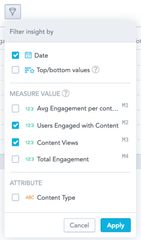 A menu appears, containing a list of attributes that are related to the metric. For example, for the Content Views metric, you will find content related attributes by which to filter it, such as Content Id, Content Title, and so on.Select an attribute from the dropdown and it is added to the metric.