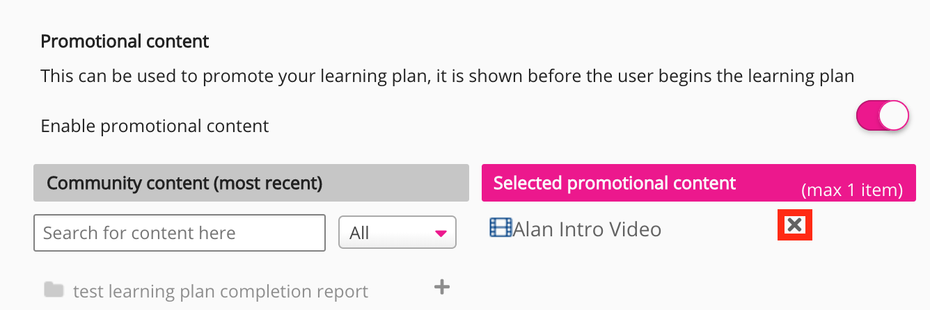 Enable Promotional content | If enabled, you can select a single item of content from the learning plan, such as a video, that users can preview on the learning plan start page. To add an item of promotional content to the learning plan start page, in the Community content (most recent) column, click the + next to the item of content. If you want to disable promotional content for a learning plan, you must deselect the item of promotional content before disabling the Enable promotional content toggle. Otherwise the promotional content will automatically re-enable. To deselect an item of promotional content, click the cross to the right of the content, in the Selected promotional content column. |