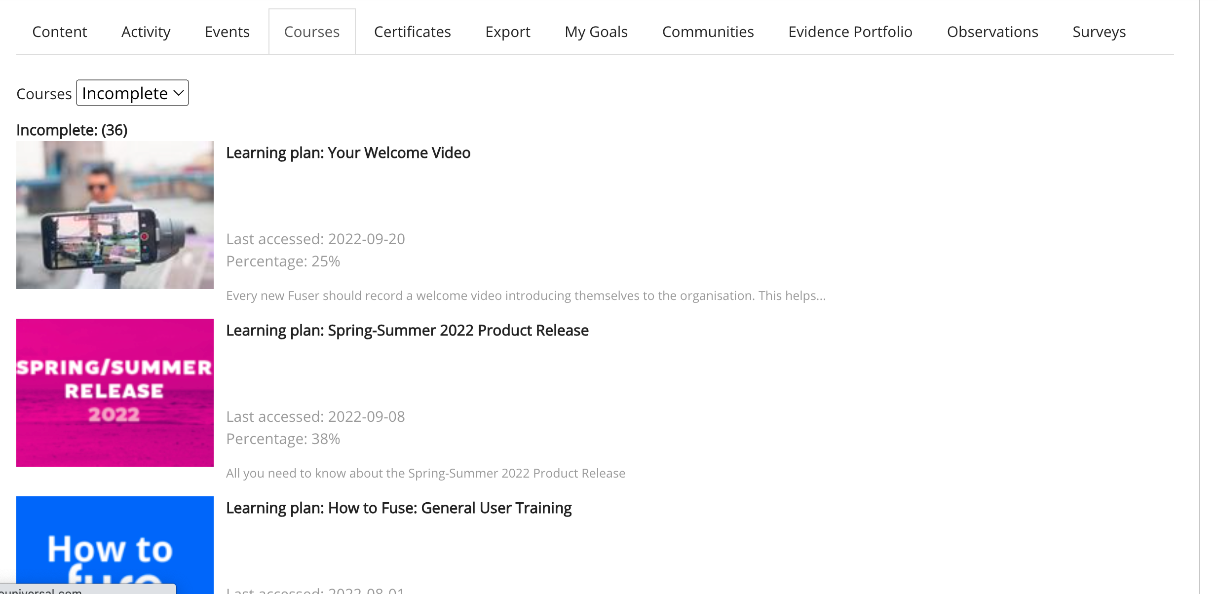 You can check an individual user’s learning plan progress and completion by going to the Courses tab in their profile page. You can filter between incomplete and complete learning plans, see how much of each learning plan the user has completed as a percentage, the date they last accessed it, and how many learning plans in total they have yet to complete.