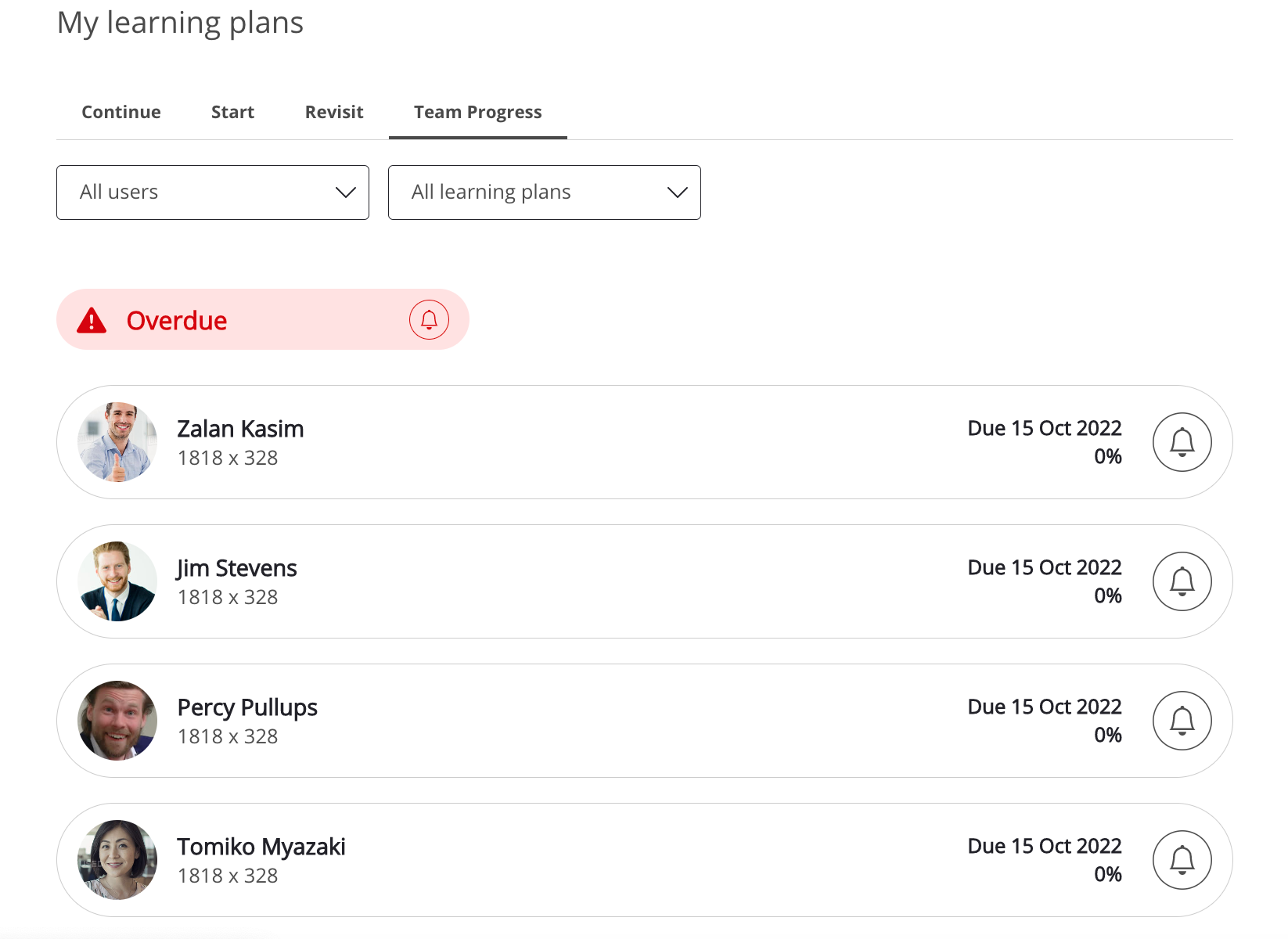 The Team Progress dashboard, in the My learning plans screen, is available if you are a manager with reportees. This dashboard allows you to monitor progress made by your reportees on learning plans they have been assigned, including recurrent learning plans assigned for compliance purposes. You can see when reportees have completed assigned learning plans, are currently in progress, have missed a deadline, or have a deadline approaching. You can also send custom reminder notifications to one or more reportees to remind them, for example, if a learning plan is overdue.