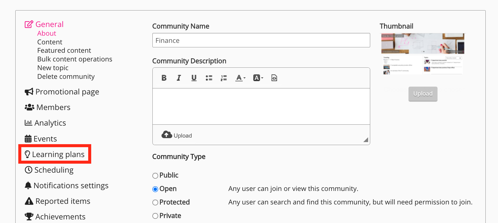 A learning plan may contain content items that are available to any other users in the community, meaning that any user can access the content and consume it, regardless of whether they are formally assigned to it via the learning plan or not.