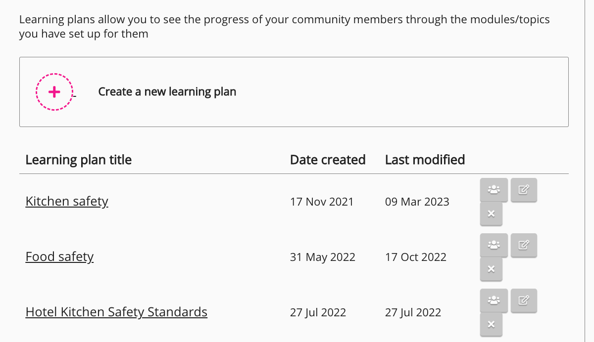 If you are a site or community admin, you can check user progress and completions for a particular learning plan in the Learning plans section of the Community admin screen screen.