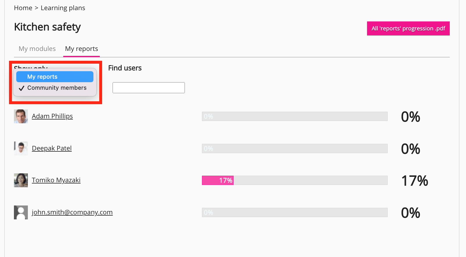 A screen appears where you can see the current progress of community members for that learning plan, as well as filter between community members and your reportees who have access to the learning plan.