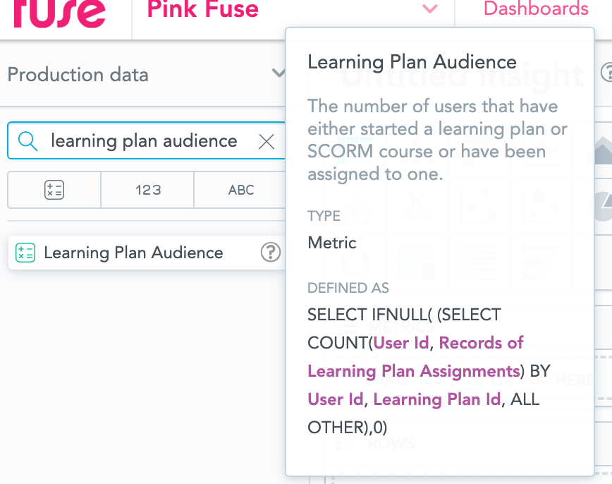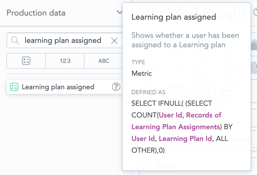 If you require data specifically related to assigned learning plans, please add the following metrics to your insights, which can be found in the Learning Plan & SCORM folder in the Analyzer tool: