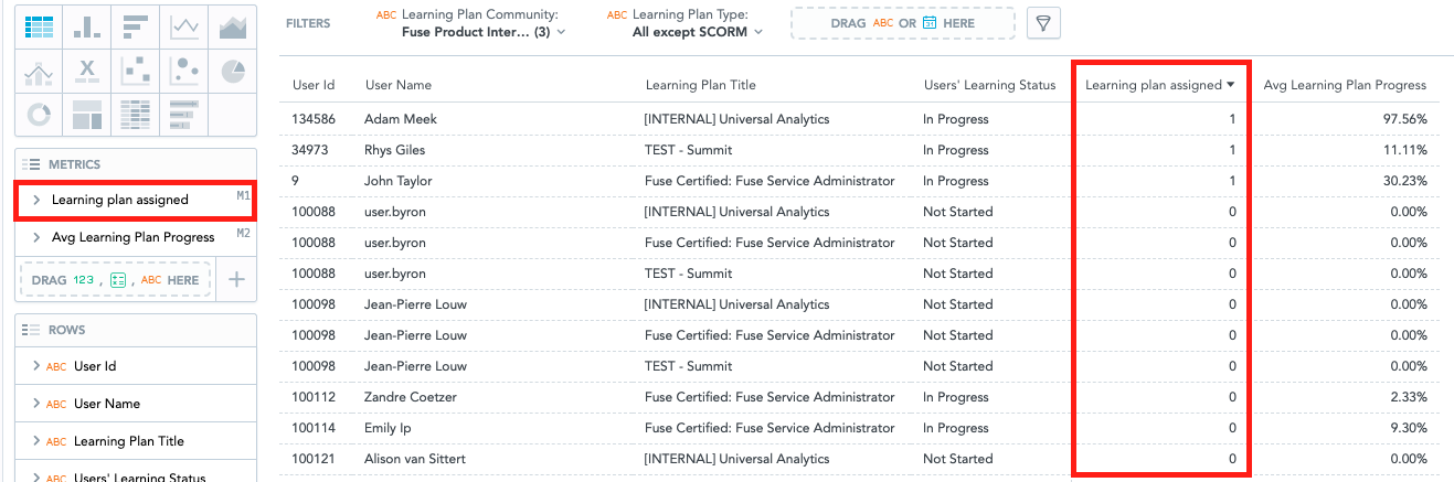 In the following example, the Learning plan assigned metric has been added to a table showing learning plan progress. This helps differentiate which users are assigned to the learning plan and which users are not. If a user has been specifically assigned, 1 is shown in the Learning plan assigned column, and if the user has not been assigned, 0 is shown.