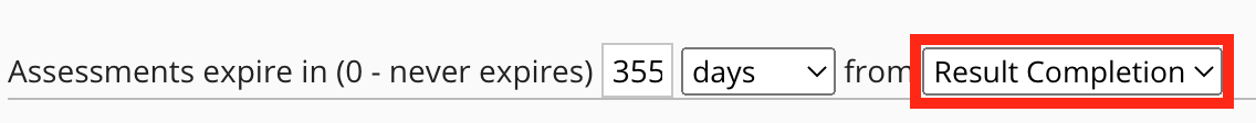 From the Assessments expire in (0 - never expires) [#] field, enter the number of days before the learning plan’s reset date, that the formal assessment(s) will reset. For example, if the learning plan resets every 365 days, you might enter 355 so that the assessment progression resets 10 days prior to the learning plan reset date.