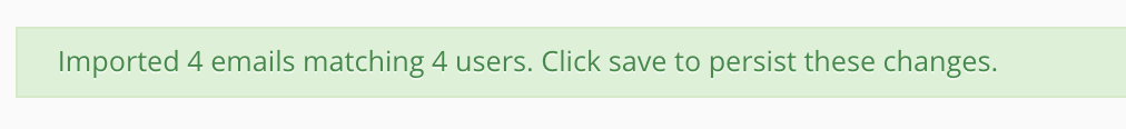 Imported [#] emails matching [#] users. Click save to persist these changes.