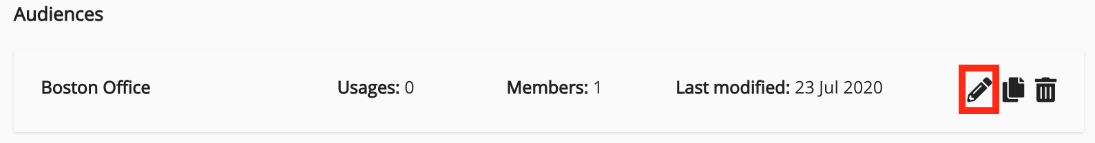 - On the Audience Management screen, click the Edit icon, next to an existing audience.