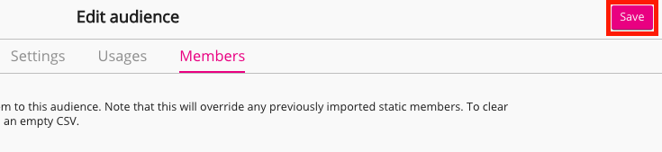 The email addresses in the CSV file must be linked to existing Fuse user accounts, in order to be added to the audience. Any email addresses not related to Fuse accounts will be ignored and you will receive the following message instead, once the import has completed:In the top-right corner of the screen, click Save.
