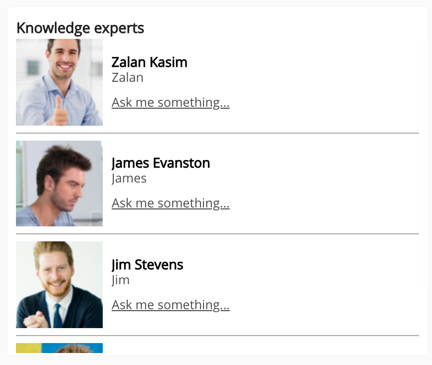 The Knowledge experts widget displays a list of knowledge experts on the homepage of a community and allows users to post a question to the community/send a notification to the knowledge expert of their choice. For example, a user might want to ask a specific expert a question related to a particular subject area, as they might have more knowledge or expertise than the other experts or users in the community. If your community has experts who are willing to be active in answering users’ questions, this is a powerful tool to drive engagement.