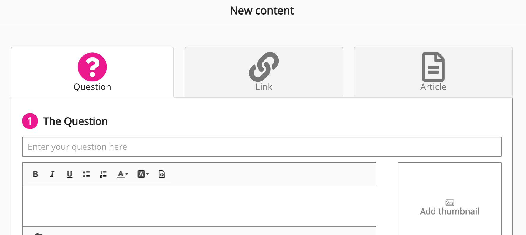 The New content screen appears and the Question tab is automatically opened.In the The Question section, enter the text of the question. You can also do the following if necessary:
