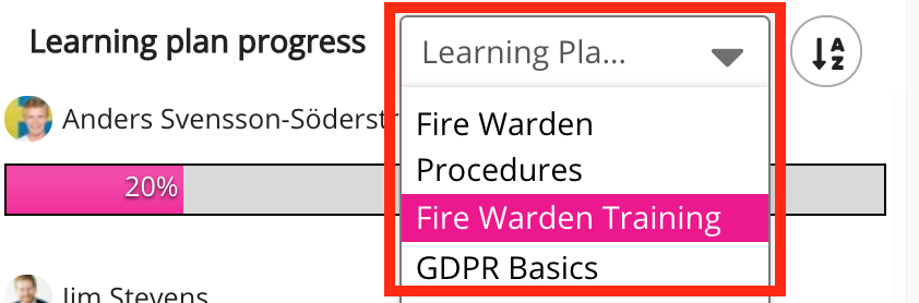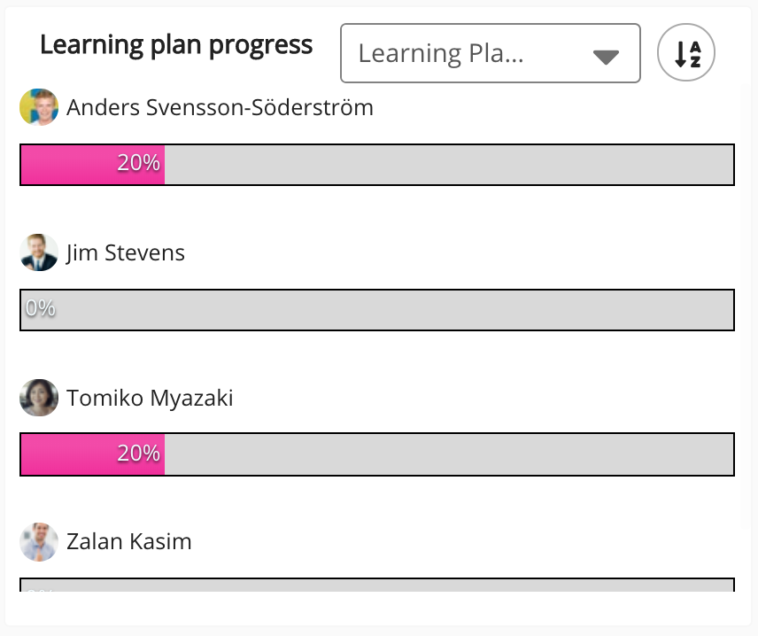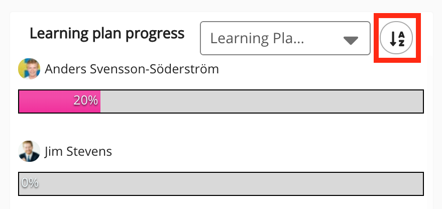 You can sort the list of reportees in each learning plan so that they appear in a certain order, using the Sort users icon, in the top-right corner of the widget.