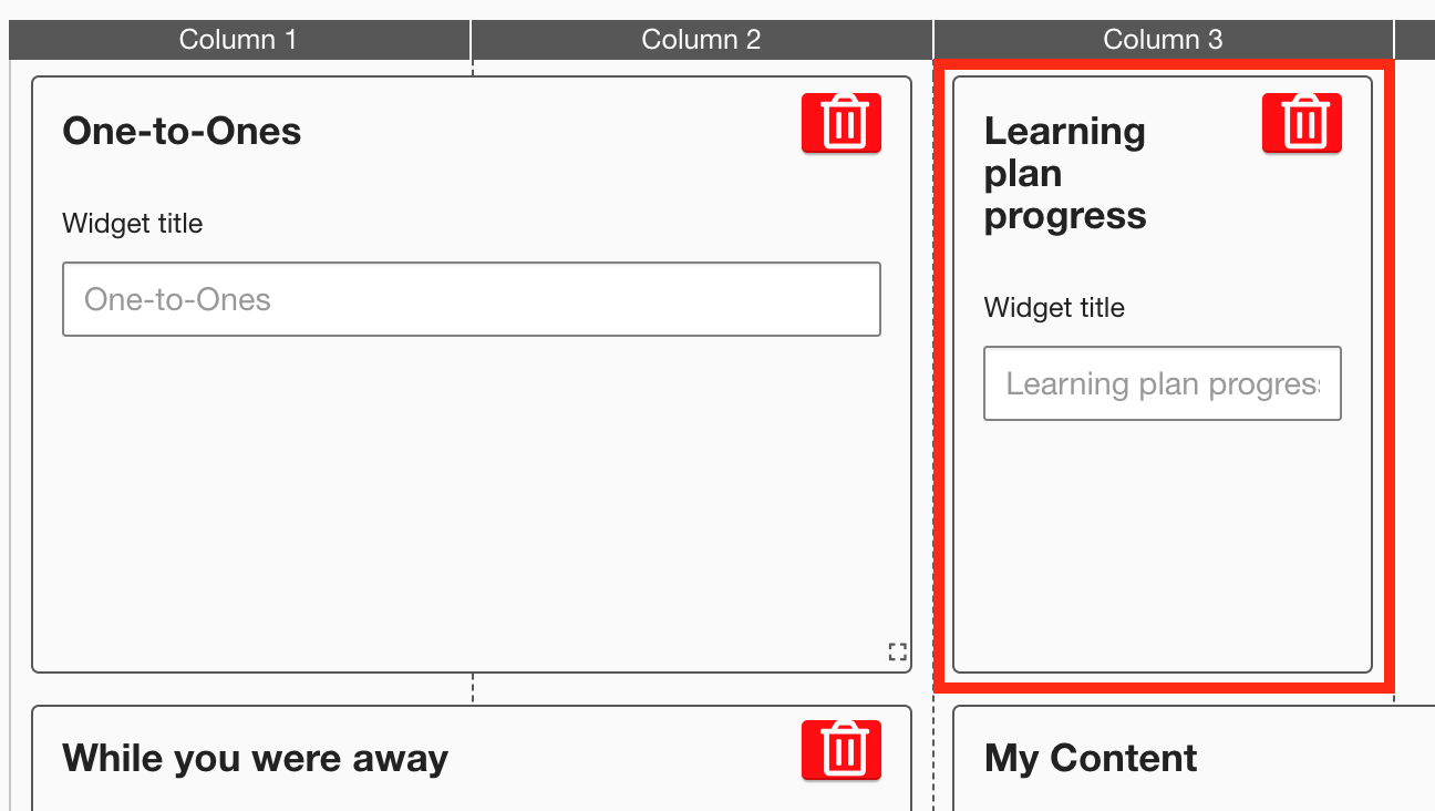 The Learning plan progress widget appears on the layout grid.[Optional] In the Widget title field, enter a custom title that will be displayed on the widget.