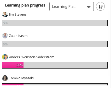 You can switch between the different learning plans your reportees are assigned to, by selecting a specific learning plan from the dropdown. When a learning plan is selected, you will see a list your reportees that have been assigned and how much progress each one has made.