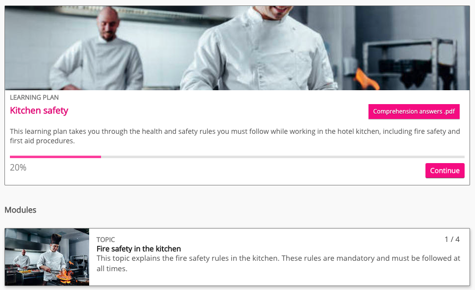 A learning plan allows community admins to group related topics, events, and SCORM courses together into modules. If you are a community admin, you can create learning plans within a community, set deadlines, and control which users have access. For example, you might create a 'Kitchen safety' learning plan for chefs in a hotel kitchen, so that they understand the necessary health and safety procedures while at work.