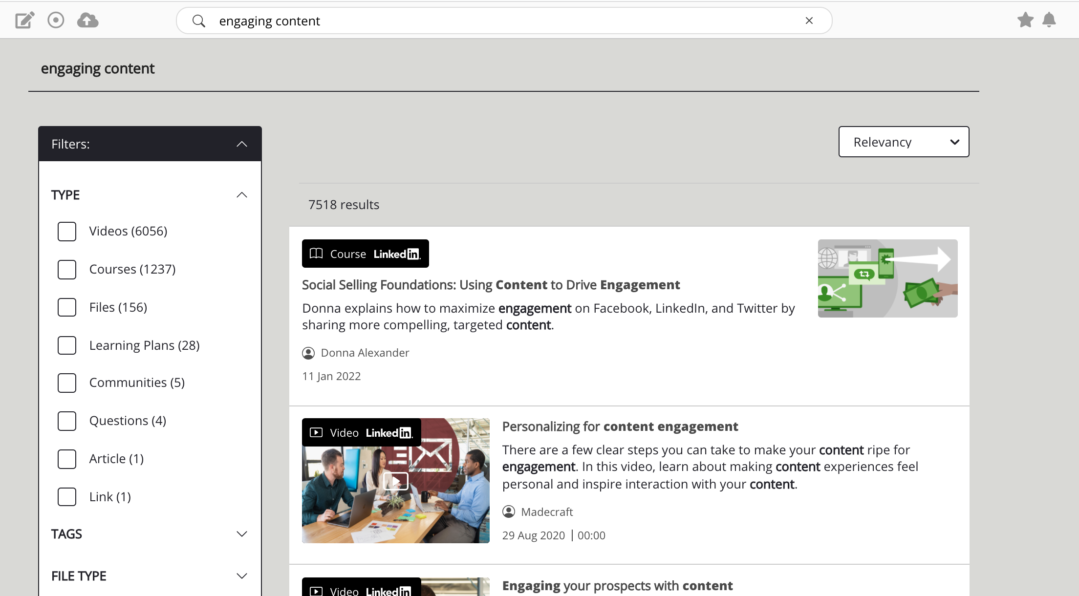 Type | Filter the list of LinkedIn Learning content by type, including learning pathways (known as 'Learning Plans' in Fuse), courses, and videos. ![]() |