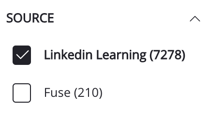 Source | Allows you to filter courses, learning pathways (labeled as 'Learning Plans' in Fuse), and videos by source. If the LinkedIn Learning connector is enabled, you can filter to show content sourced from: