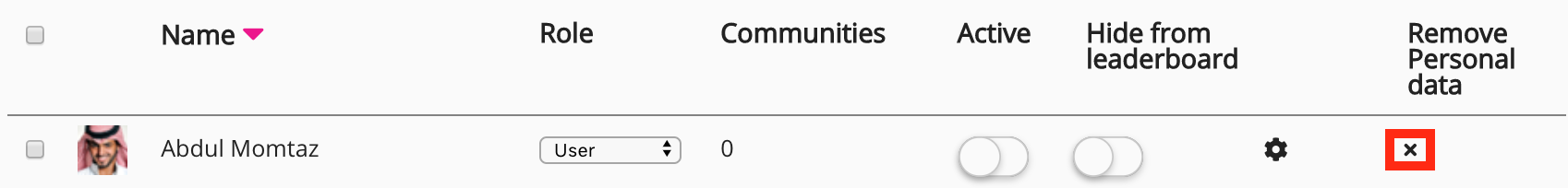 Deactivated users are still visible in the list of users and a cross is displayed in the Remove Personal data column in the Manage users table. Click the x to completely remove all of the user's personal data from Fuse. |