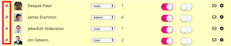 Select one or more users from the Manage users table, and perform bulk operations on those users, including setting user roles, adding users to communities, sending a welcome email, activating/deactivating users, and hiding users from the leaderboard.