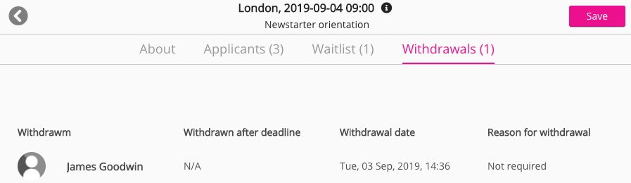 Click the Withdrawals (#) tab to view all users who have withdrawn from the occurrence. The table below lists the information available for each user listed on the Withdrawals (#) tab.