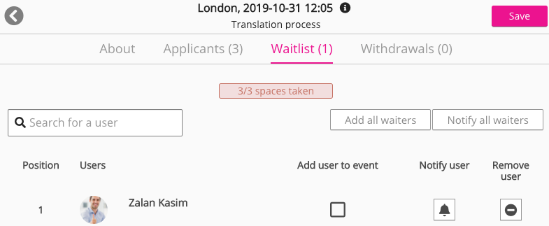 Add user to event | To add individual waitlisted users to the occurrence: This setting automatically increases the number of spaces to cater towards the waitlisted users being added.