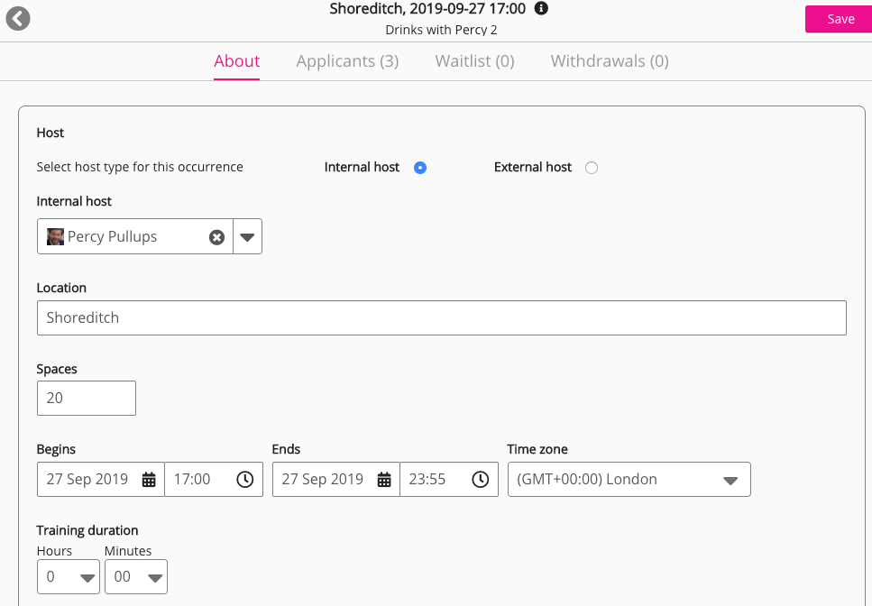 You can manage and adjust the settings for each occurrence in an event on the occurrence management screen. The occurrence management screen is spilt into several tabs, each related to different area of an event occurrence. Here you can adjust various settings such as the description, the host, the number of spaces available, the start and end dates, as well as manage applicants (such as adding, removing, and bulk-importing attendees to the event occurrence), viewing user withdrawals, and managing those on the waitlist.