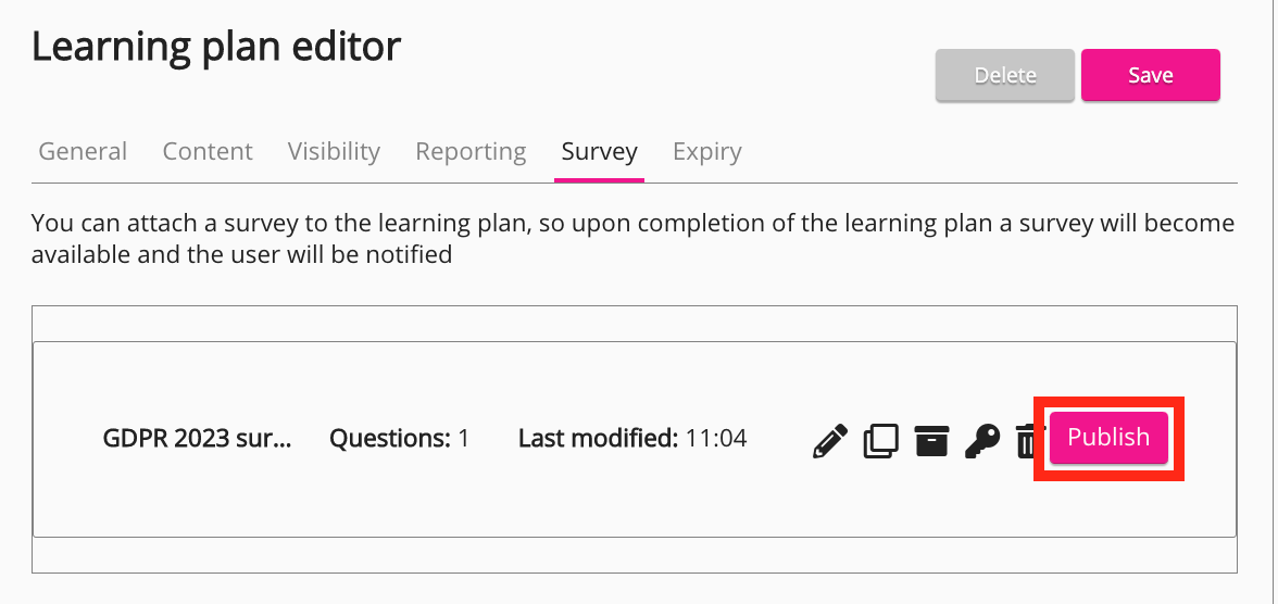 If the learning plan in the old community had a survey attached, edit the new learning plan and then recreate and attach the survey in the Survey tab.
