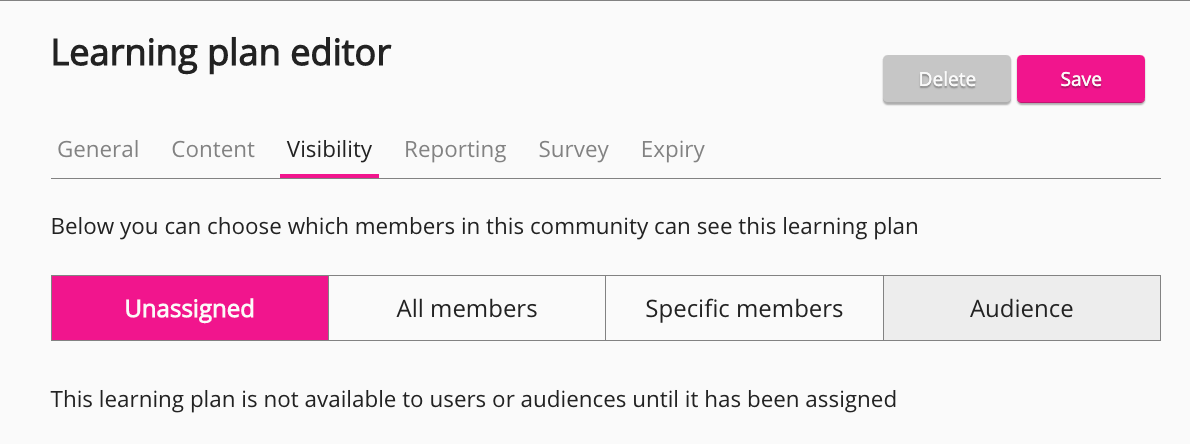 In the Visibility tab, the visibility of the new learning plan is set to Unassigned for now, so that no users in the new community are assigned before the learning plan is fully set up.