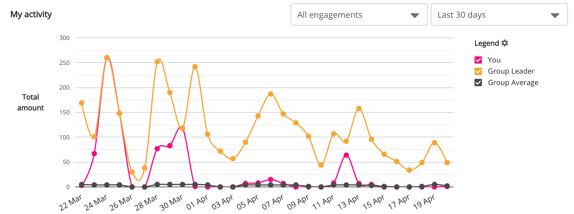 Prior to deprecation, the My activity widget could be added to the User Dashboard page in Design Studio and showed your activities, such as the number of content views, comments, likes, shares and items of content created, compared to the group leader and group average.