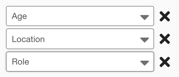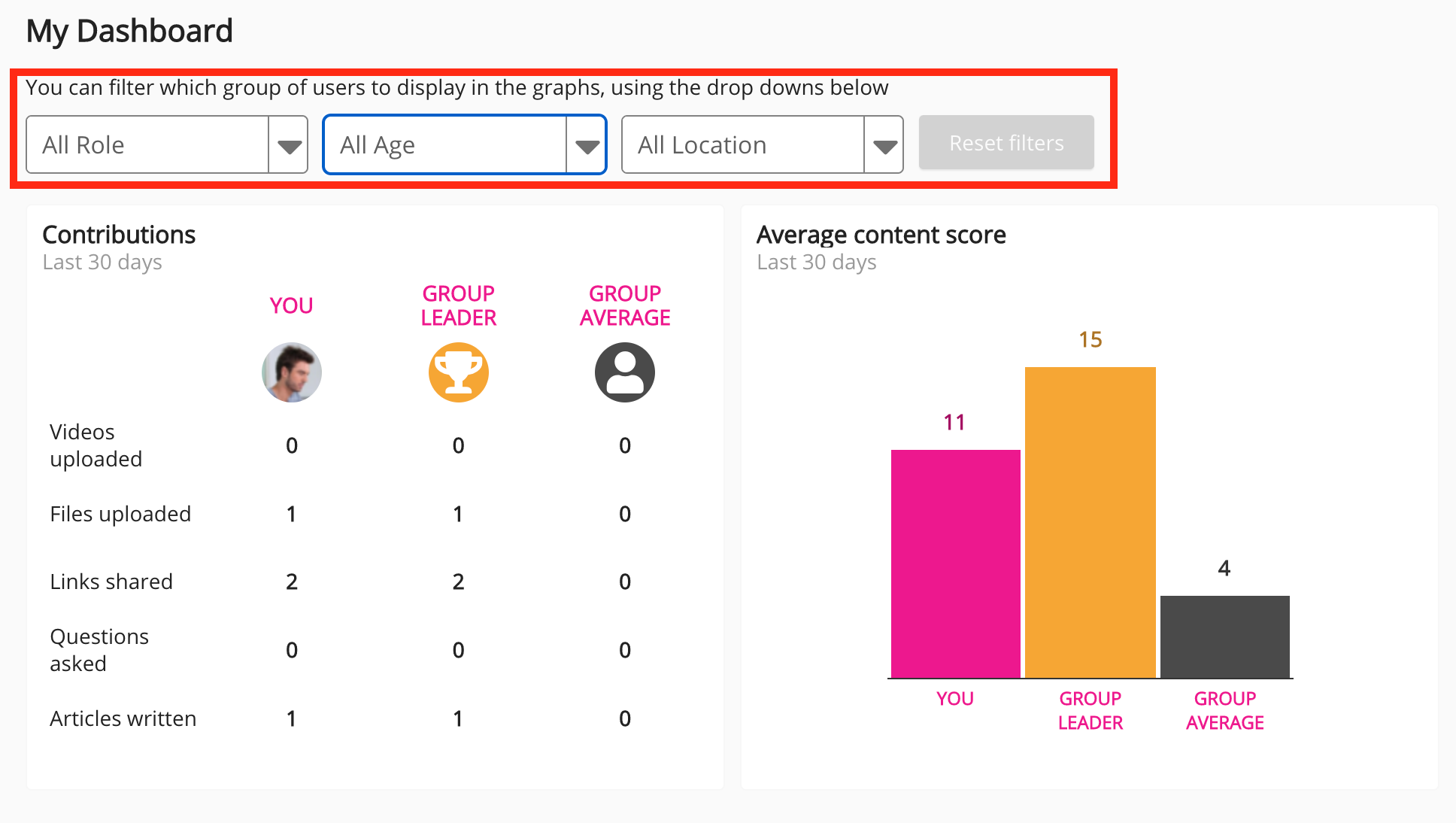 If you have added the My activity, Average content score or Contributions widget, you can configure the filter options that can be selected by users when viewing the My Dashboard screen. You add a maximum of 3 custom profile fields, so that users can filter the data displayed on the My activity, Average content score and Contributions widgets. For example, you might add Age, Location and Role custom profile fields, so that users can filter the data by age, location, and role.
