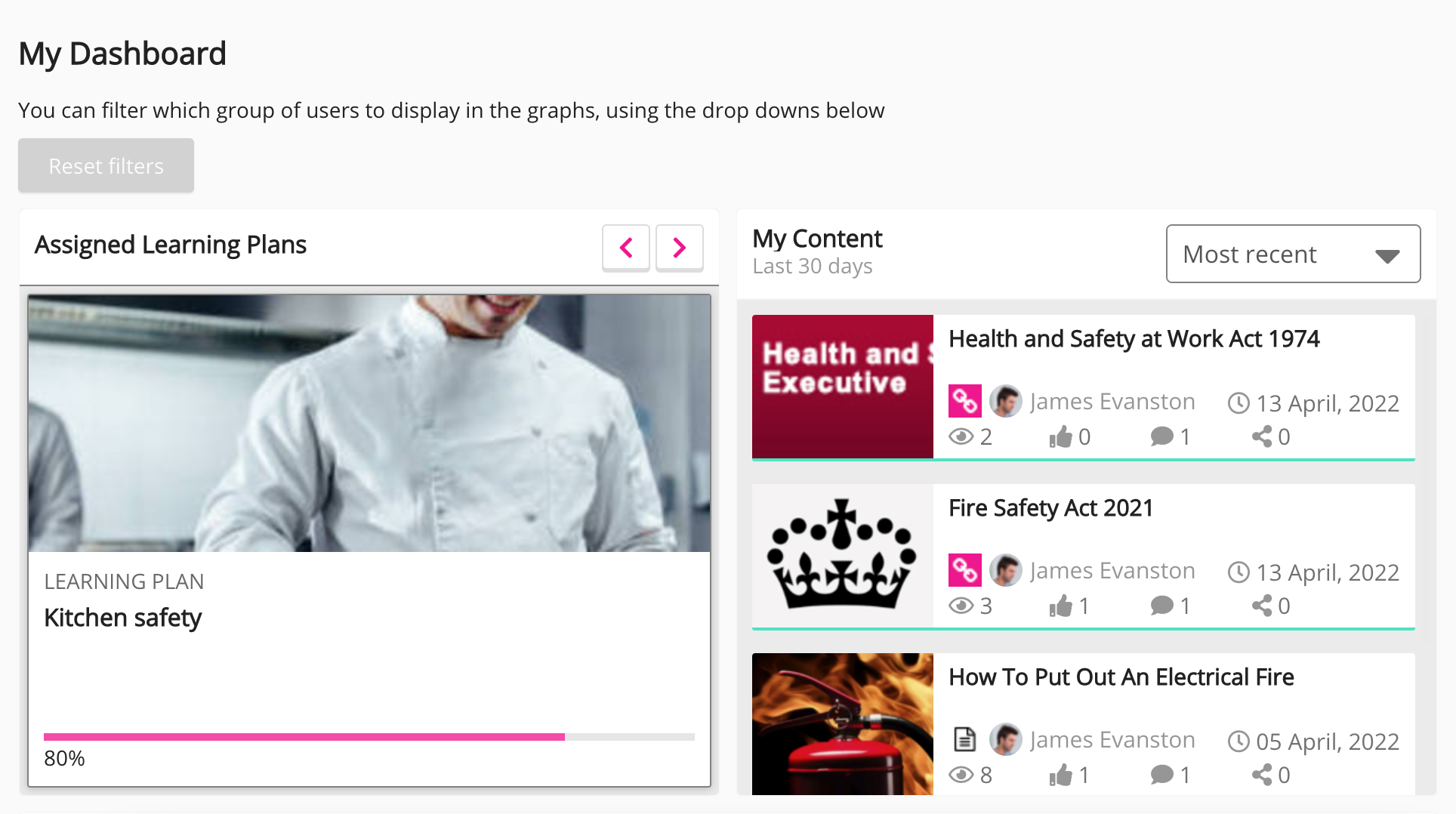 From 1st August 2022, the graph showing page views, content views and engagement metrics on the legacy Analytics screen will no longer be available. This also means the Contributions, Average content score and My activity widgets will also cease to show data when placed on pages such as My Dashboard. Going forward, you can access data related to page views, content views and engagement metrics in Universal Analytics. For more information, see this Fuse post.