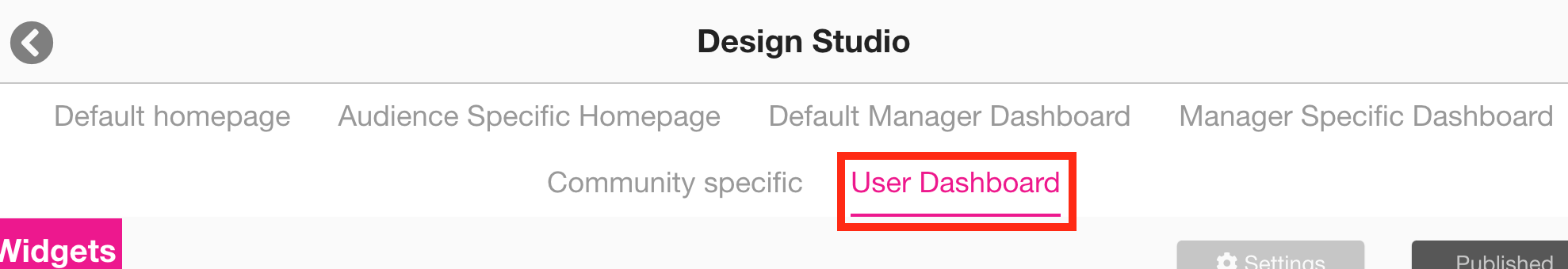 Design Studio appears.Click the User Dashboard tab.