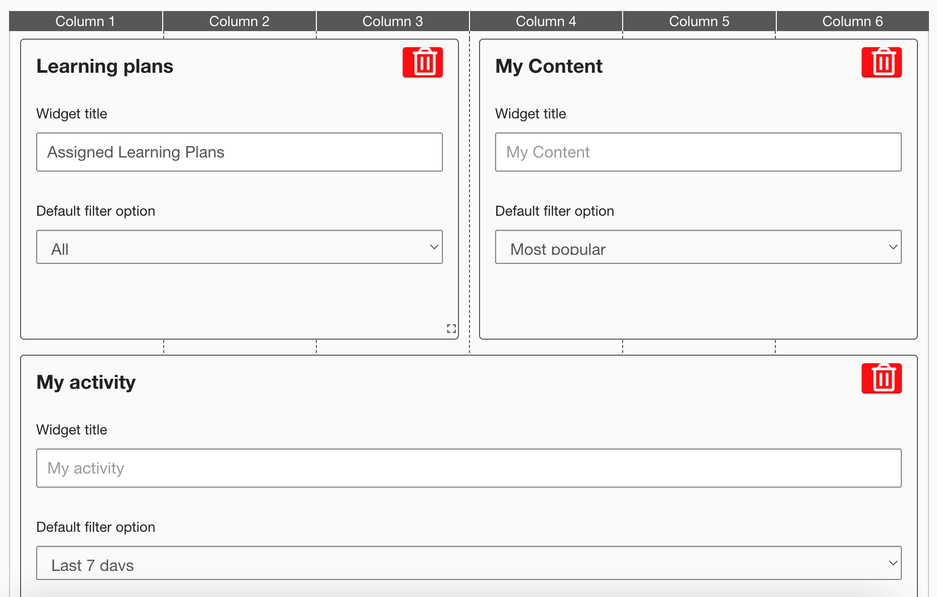 Drag widgets onto the layout grid, move them to the correct positions, and resize them to the desired width. For a list of available widgets, see the Available widgets section below.