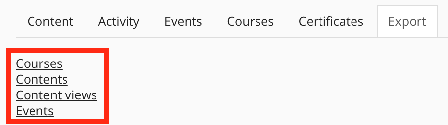 Export | Export a CSV file containing information about courses, content, and events you have interacted with. The following information can be exported: