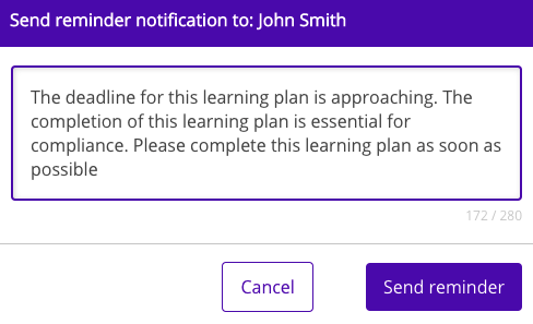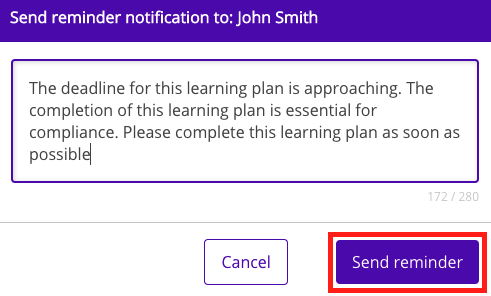 Enter a message to accompany the reminder notification. For example, if the reportee is overdue, you might enter the following: “The deadline for this learning plan is approaching. The completion of this learning plan is essential for compliance. Please complete this learning plan as soon as possible”.
