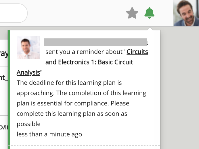 A reportee can receive multiple notifications if they are in progress, have an upcoming deadline or are overdue for multiple different learning plans. For example, if one particular user is overdue for 5 different learning plans, and you have sent a notification to all users in the Overdue list, that user will receive 5 separate notifications - one for each of the learning plan that is overdue.
