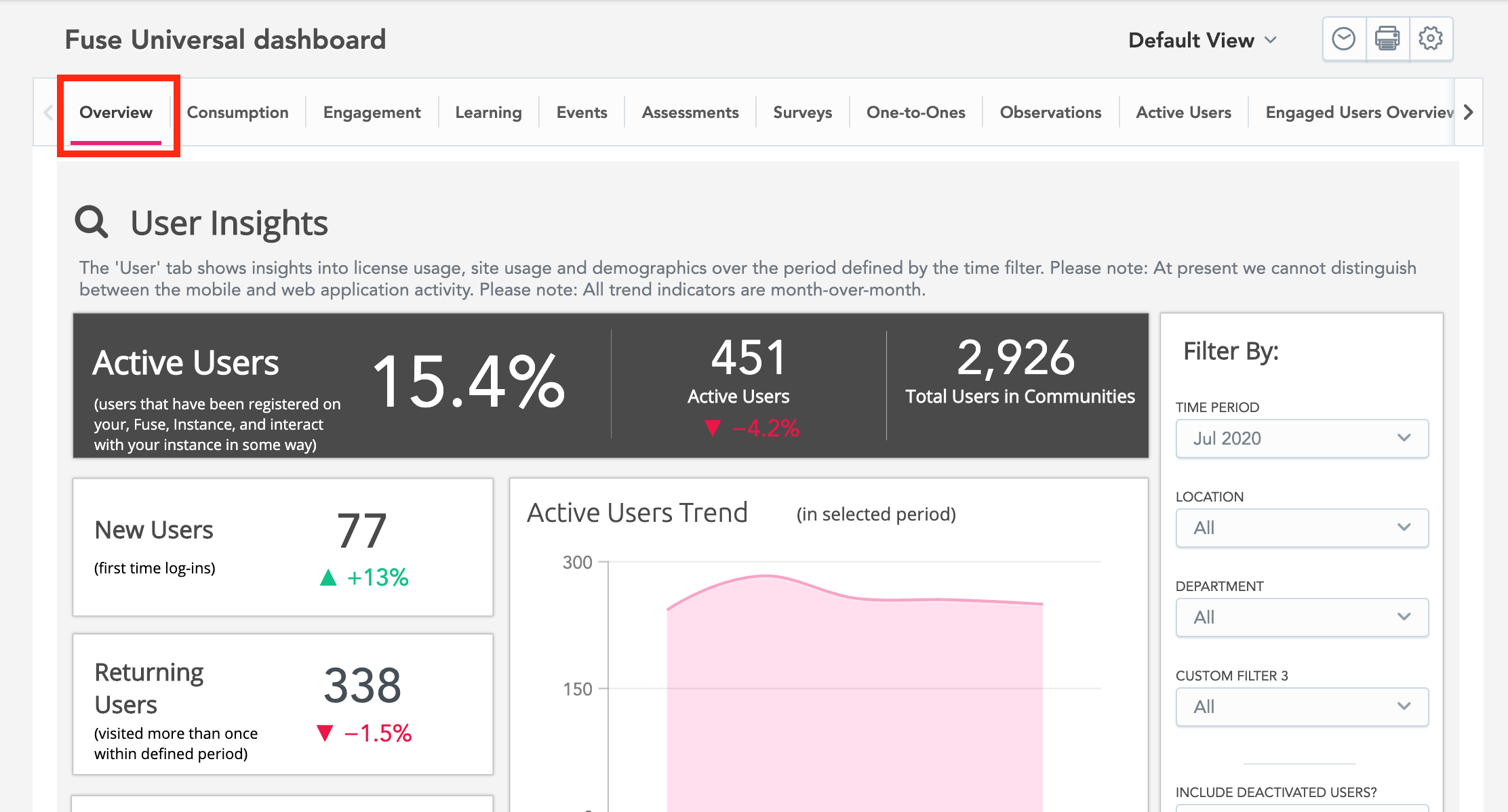 - Site usage (the number of active users and the number of users not logging in).