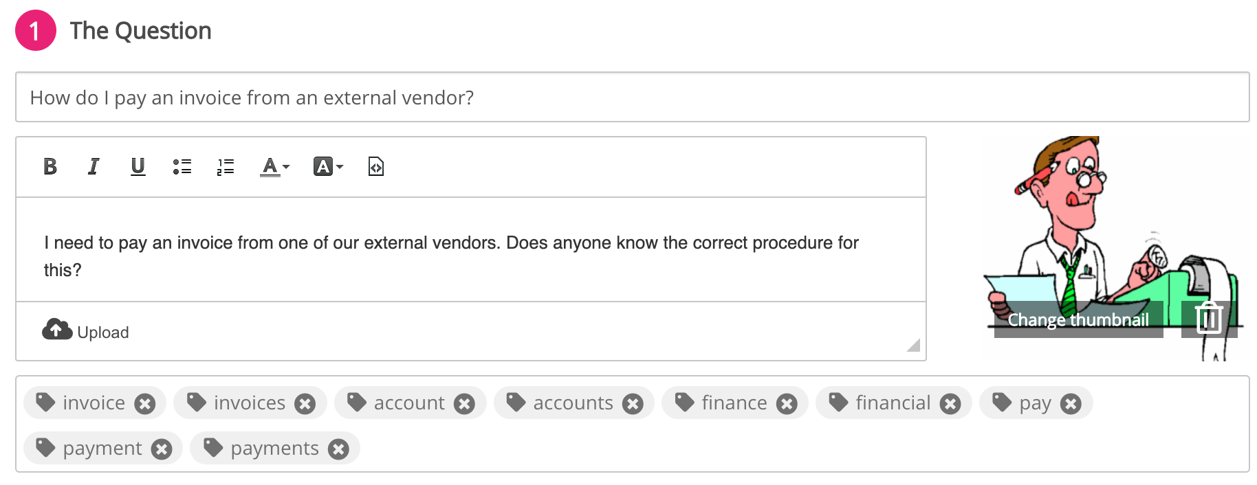 If necessary, in the Tags field, enter one or more tags. Tags make it easier for users to find content when searching. For example, if the question relates to paying an invoice, you might add the following tags.