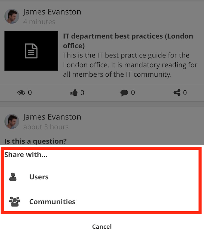 After the item of content has been posted, the Share with... popup will appear. The Share with... popup allows you to share the content with one or more individual users or additional communities.