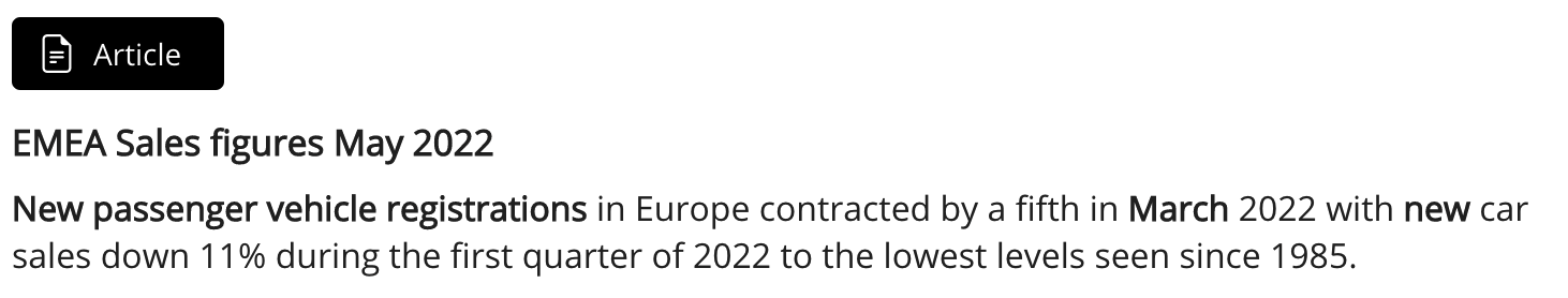 Body text: In March 2022, the European new car market was 20% weaker with electric vehicles gaining market share and the Tesla Model 3 the top-selling car in Europe. New passenger vehicle registrations in Europe contracted by a fifth in March 2022 with new car sales down 11% during the first quarter of 2022 to the lowest levels seen since 1985. Electrified cars continued to gain market share and again outsold diesel vehicles in Europe in March 2022. The Tesla Model 3 was the top-selling car model and the best-selling battery-electric vehicle in Europe in March 2022 but the Peugeot 208 was Europe’s favorite car during the first quarter of the year.