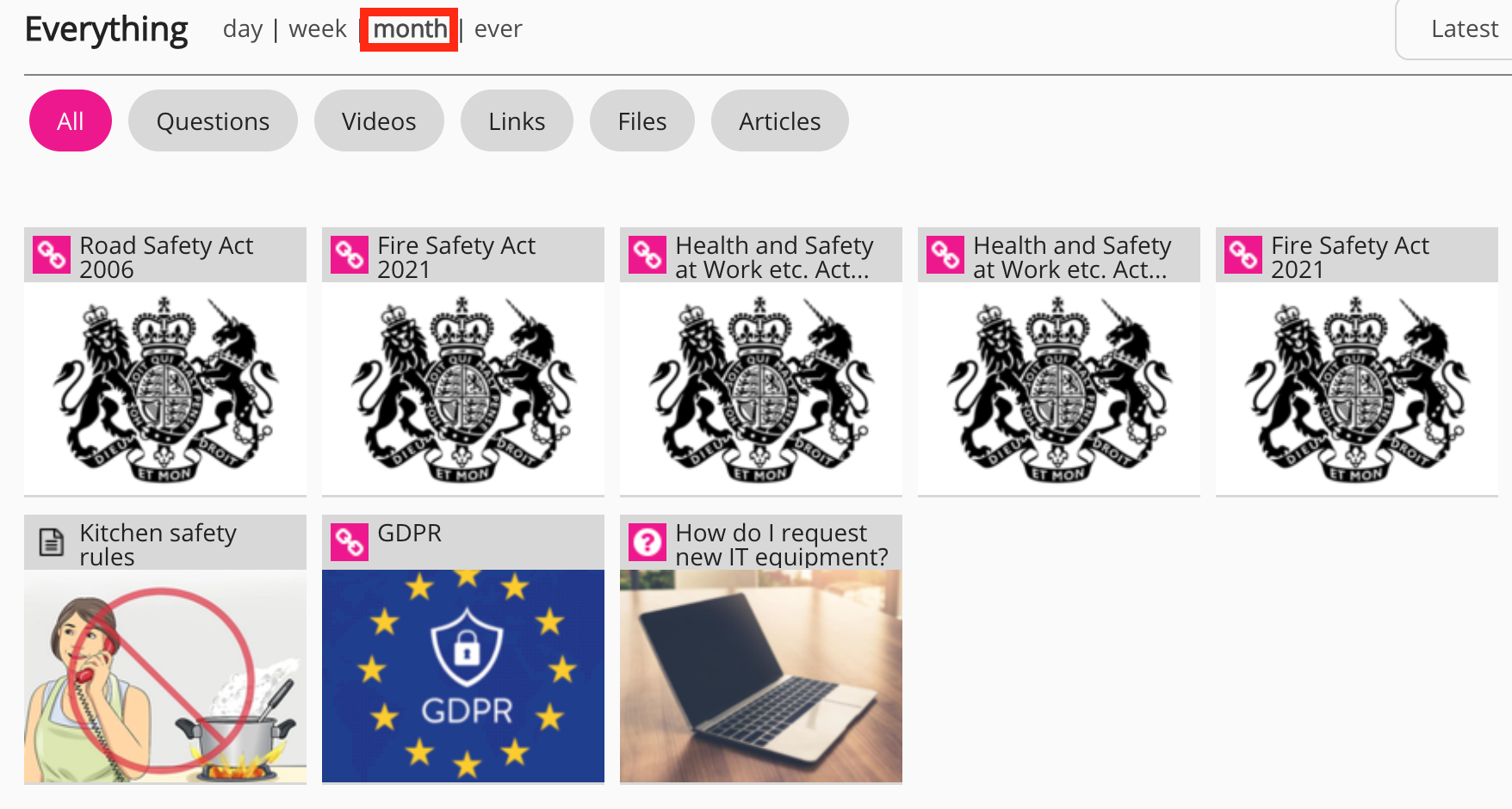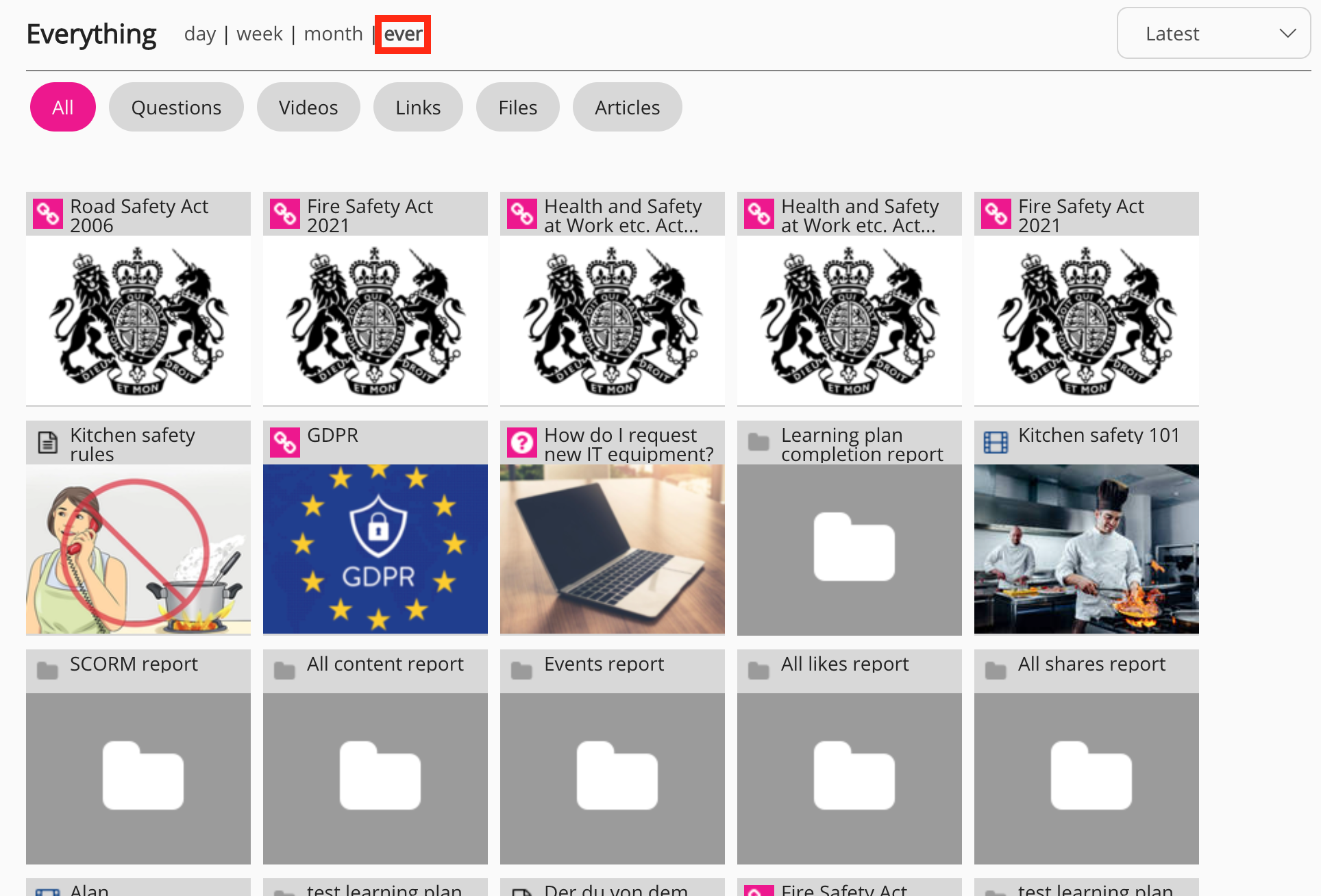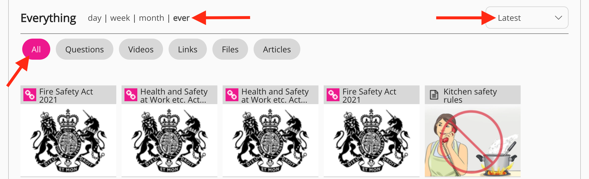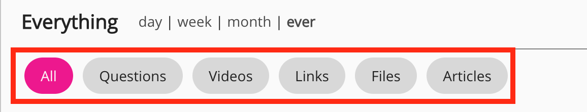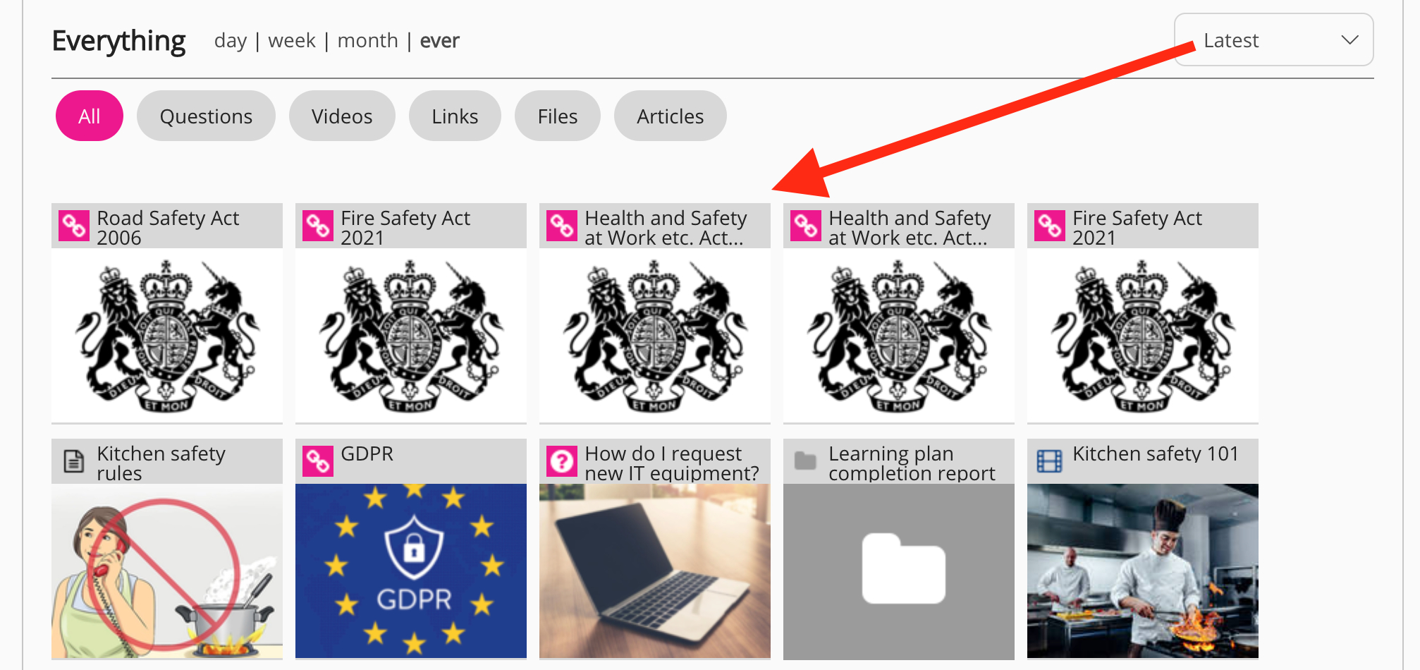 You can filter the list of content by type, including questions, videos, links, files, and articles. The All filter is selected by default when you land on the Recently added content screen.