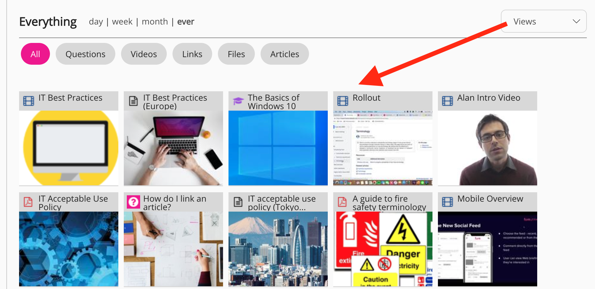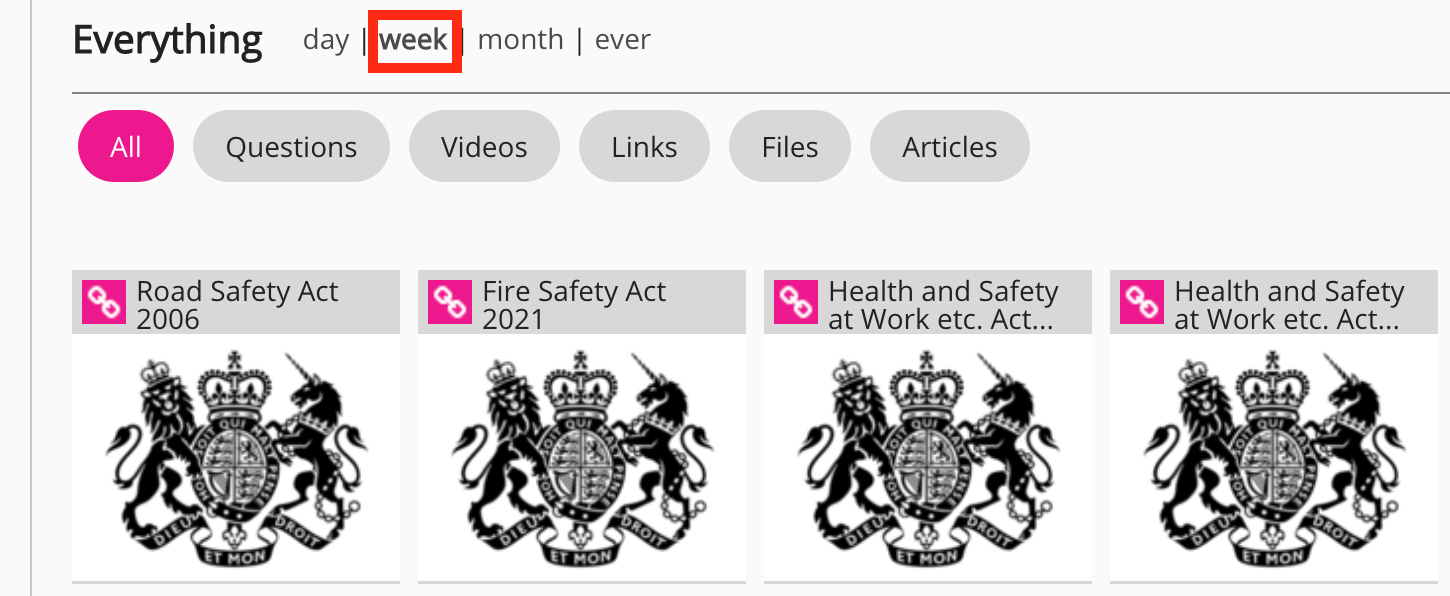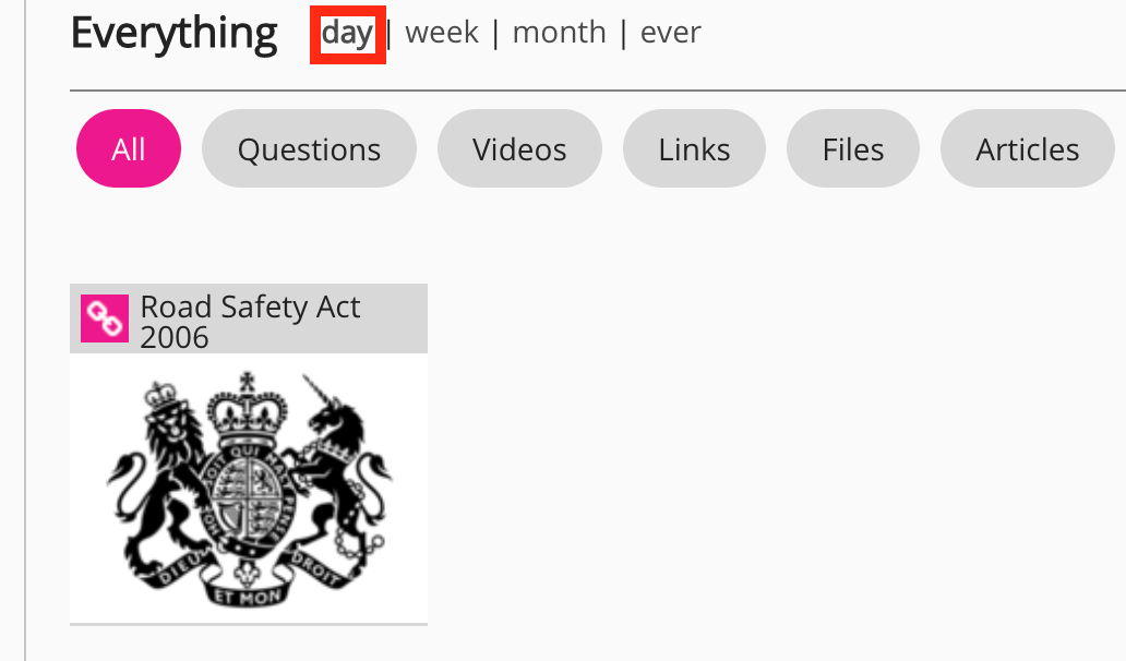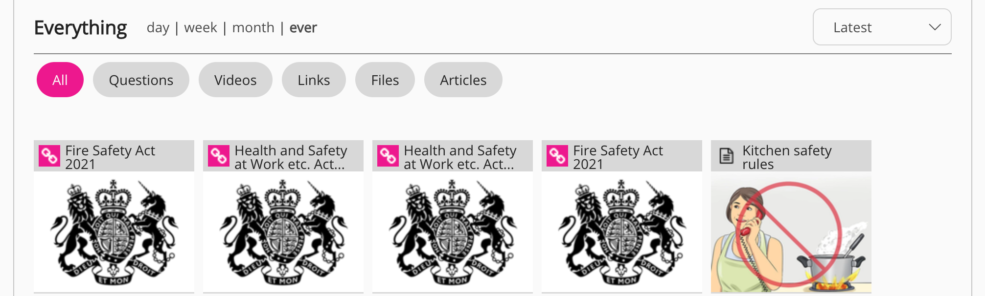 You can filter the list of content by type, including questions, videos, links, files, and articles. The All filter is selected by default when you land on the Recently added content screen.