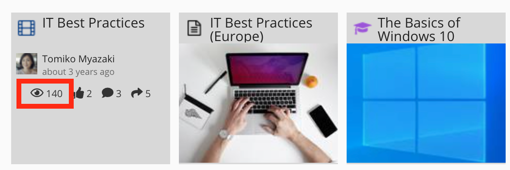 Likes | Sort the content based on the number of likes. If selected, content is ordered ranging from most viewed to least viewed. ![]() To see how many likes an item of content has received, hover over the item of content in the list. ![]() |