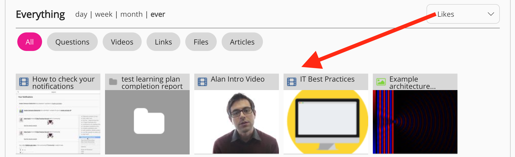 By default, the Recently added content screen displays a list of recently posted content from communities you belong to, including questions, videos, links, files, and articles. If the Recently added content screen contains a lot of content, you can filter the list by type, time period, recency, most views, and most likes.