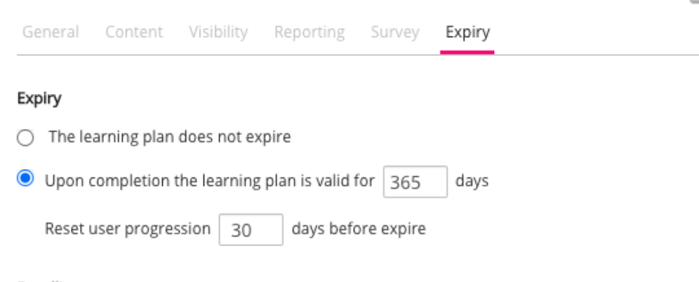 When configuring this recurrent learning plan, you can do the following in the Expiry tab tab:
