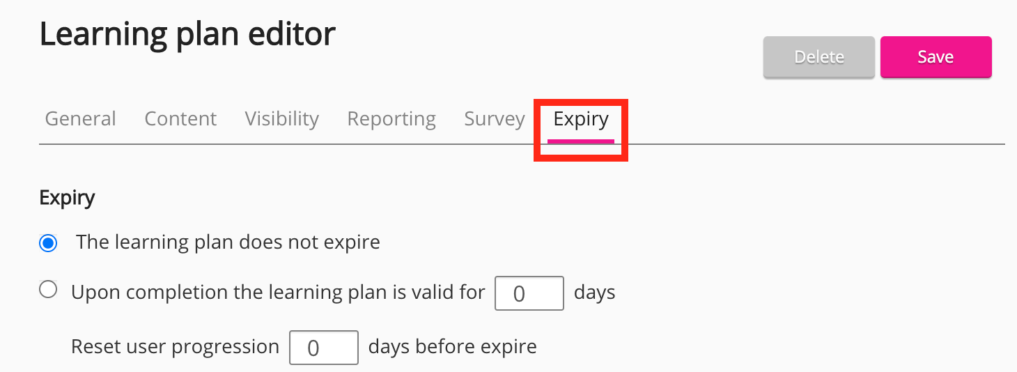 In the Expiry section, select Upon completion the learning plan is valid for [365] days. Reset user progression [60] days before expire. This is so that the user is compliant for an entire year but must recomplete the learning plan no earlier than 60 days before expiry.