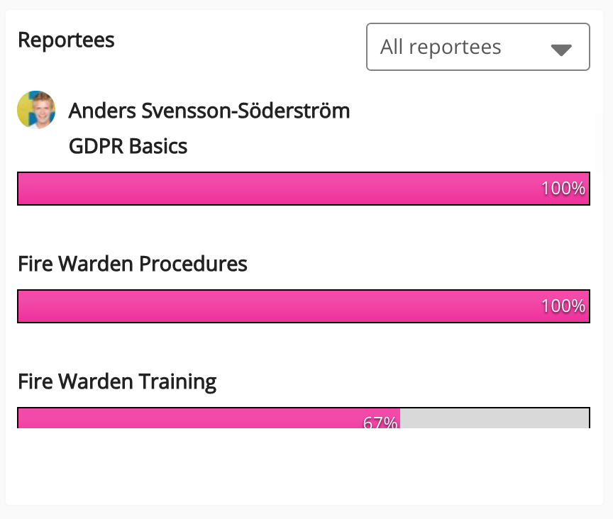The Reportees widget allows managers to see the learning plan progress for each of their reportees.