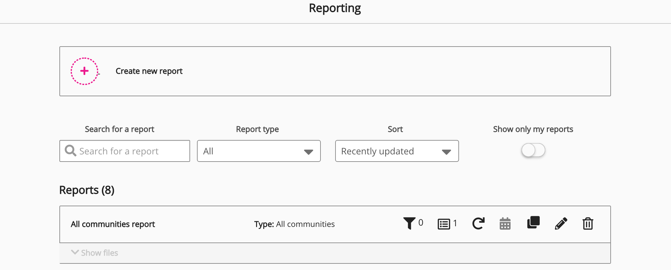 The Reporting (Legacy) screen allows admins to generate reports on a wide range of Fuse activities, such as an overview of comments left on Fuse within a specific period of time and survey results. When a report is generated, a CSV file is produced and uploaded to Fuse, where it can downloaded.