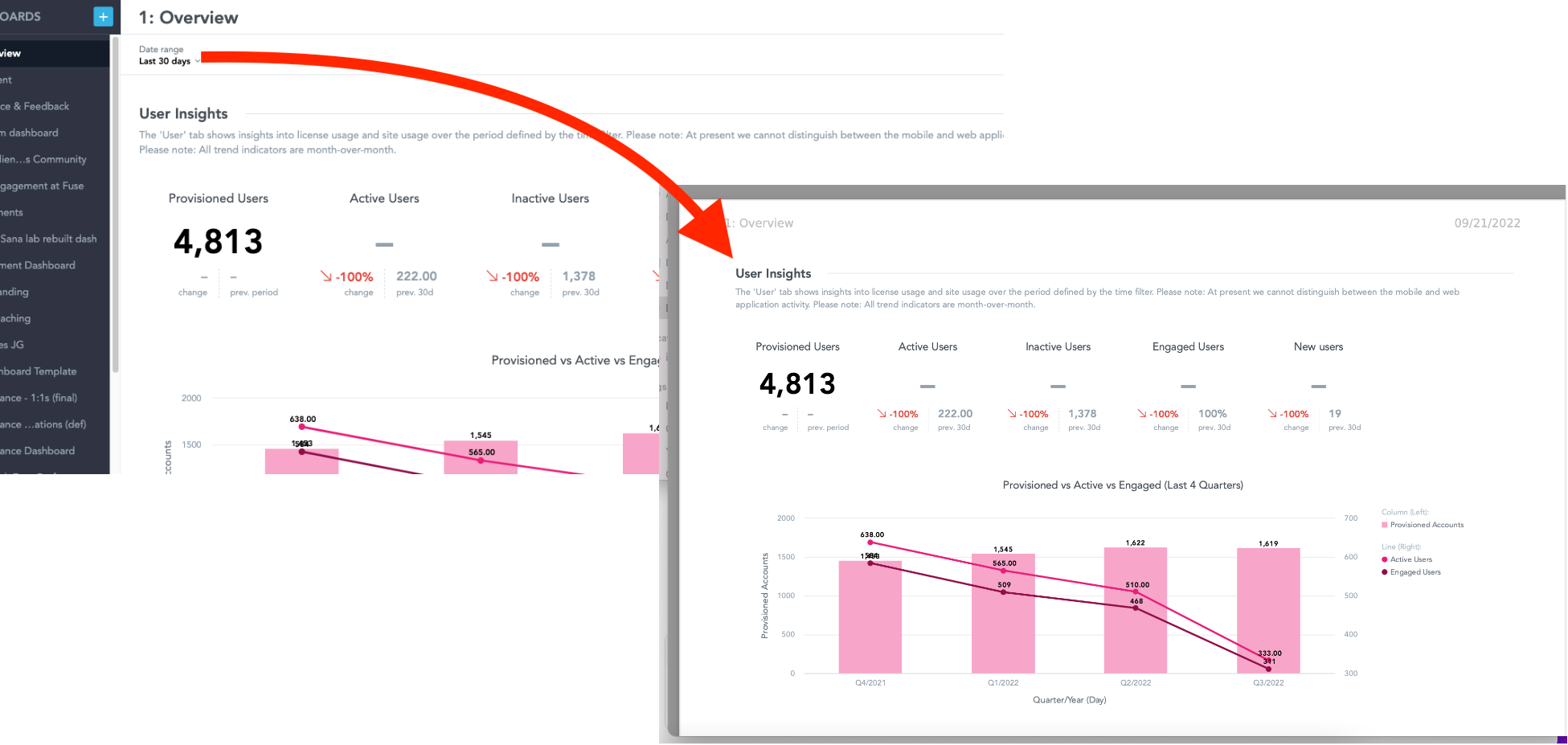 If you have applied filters to the dashboard at the time of setting up the scheduled email, insights shown in the attached PDF are filtered based on this. For example, the dashboard below has been filtered to only show data from the last 30 days. This means the insights in the PDF are also filtered to show data from the last 30 days by default. The attached PDF always reflects the filters set at the time the PDF is exported from Universal Analytics.