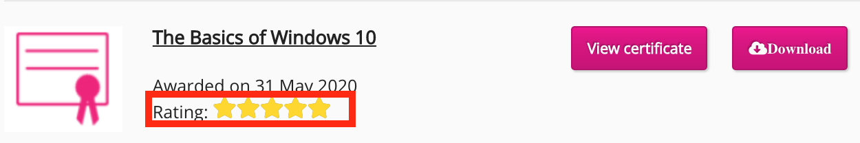 Star rating | A star rating only appears on a certificate if you have completed an assessment/quiz within the SCORM course. The stars on the rating equate to a percentage on the full certificate. You can check the percentage by viewing or downloading the full certificate. If you fail the assessment/quiz, the SCORM course is not marked as completed and the certificate won't appear in the Certificates tab. If you have not been awarded any stars, it means no assessment was built into the SCORM course. If the SCORM course does not include an assessment and you have completed the course, you will be awarded a certificate and the completion will be based on the number of slides viewed, or when you have viewed the final slide. ![]() |